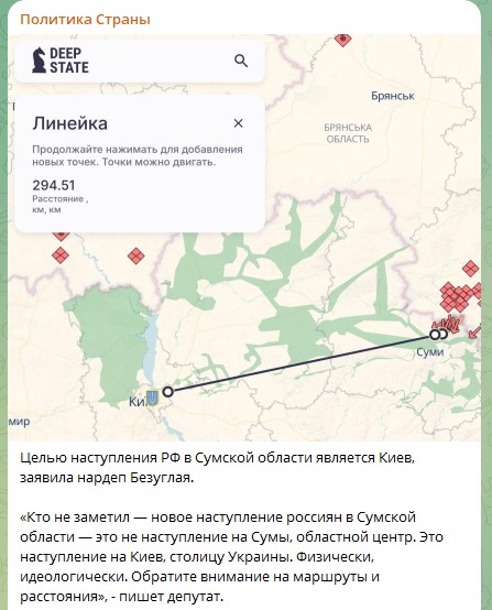 По словам депутата Верховной рады Марьяны Безуглой, целью наступления русской армии в Сумской области является Киев.