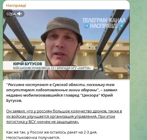 Тем же на Украине, кто ещё полгода назад смеялся, когда ВСУ зашли в Курскую область и творили там бесчинства, теперь не смешно. Русская армия становится ближе и ближе. Недавно мобилизовавшийся главред украинского издания "Цензор" Юрий Бутусов заявил о том, что "русские наступают в Сумской области, потому что там нет подготовленной линии обороны".