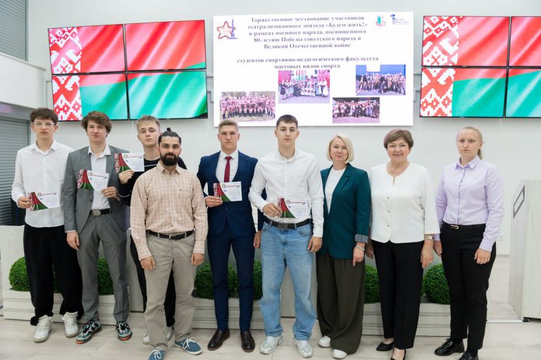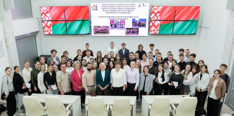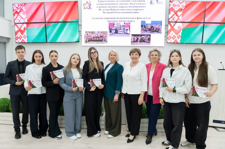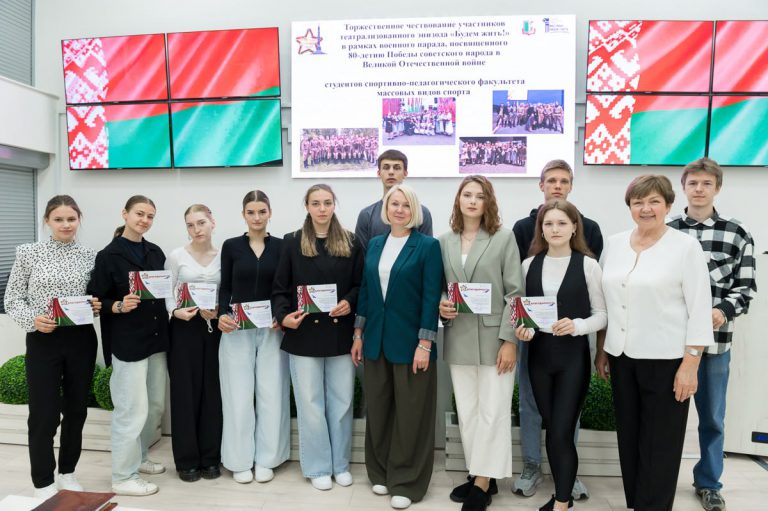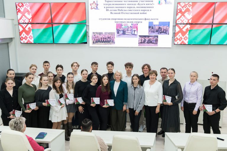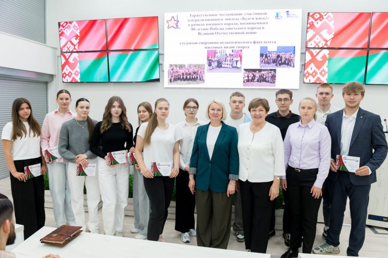 На спортивно-педагогическом факультете массовых видов спорта в торжественной обстановке вручили благодарности ректора университета Сергея Борисовича Репкина студентам за участие в театрализованном эпизоде «Будем жить!» в рамках военного парада, посвященного 80-летию Победы советского народа в Великой Отечественной войне.