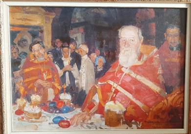 Портрет протоиерея о. Василия Ермакова художник писал сразу после Пасхальной службы в храме преподобного Серафима Саровского. Нарядные красные одежды священника, пасхальный стол с куличами в свечах, своды храма, многочисленные прихожане, что не торопятся покидать церковь – таков антураж, на фоне которого любимый паствой настоятель, не уставший от службы, а в омофоре благодати предстает на портрете. И это продолжение темы веры, пути к Богу, служение Ему и людям.
