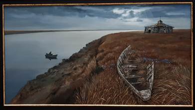 Да, мало таких селений, и людей в том краю на краю Земли тоже немного. Самые крепкие, вросшие в эту землю рыбаки, охотники, ремесленники сродни своей малой родине. Пишешь слова и понимаешь, как много в них общих корней. Смотришь на высохшую лодку, покосившуюся церквушку под небесным светом и рыбака, застывшего на реке, а вспоминаешь лермонтовские строки про золотую тучку, что ночевала на груди утёса-великана. И можно было бы подумать, что есть в этом какая-то обреченность, но нет. На берегу лодка иссохла, а на воде, где ей и надо быть, рыбак в лодке, - тянется нить поколений. И если так сильна любовь к родной Якутии, а она вся на полотне - значит, крепка и вера...