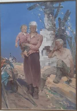 Особое внимание на выставке привлекает картина Заслуженного художника РФ Виталия Боровика «Возвращение», созданная в этом году, написанная по мотивам трагедии Донбасса. Семья вернулась к родному очагу, от которого остался лишь остов кормилицы-печки. Непрекращающиеся многолетние бомбежки Донбасса киевским режимом не сломили в этих людях веры в свою родину, семья выписана как монолит, ядро, корень, от которого уже началось возрождение – сидящий на руках у матери сынишка.
