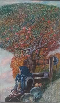 Перекликается по теме с этой картиной и полотно Заслуженного художника РФ, члена-корреспондента РАХ и действительного члена Петровской академии наук Анатолия Рыбкина «Семья. Земля родная». Как будто выхваченный в кинопленке фрагмент жизни семьи, а на какие размышления наводит полотно. В натруженных руках женщины, старшей, видимо, в семье, «дремлют поминутно спицы», а думы далеко от дома – вся её фигура – воплощенное ожидание: дерево полно плодов, а у старого колодца уютно дожидаться родных, - где они? Земля заждалась своих работников.