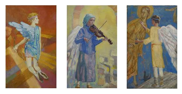 Интересны работы Андрея Кугаевского, написанные в 2025 году «Ангел Музыки», «Ангел Балета», «Ангел Живописи». Они являют собой благодарность автора невидимым покровителям трех видов искусств, помогающих на тернистом пути творчества. «В этих работах я пытался выразить свое прочтение выставки «Я верю...», - говорит Член Союза художников России, член-корреспондент Российской академии художеств Андрей Кугаевский.