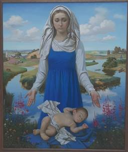 Картина «Свете тихий...» Юлии Беховой по сюжету напоминает одно из известных полотен прерафаэлитов, вместе с тем сюжет и почерк автора созвучен композициям эпохи Возрождения. А вот, как сама художница говорит о своей картине: «Эта картина много значит для меня. Образ родной русской земли, красота Пушкиногорья дороги моему сердцу со студенческих времен. Состояние летнего дня, клонящегося к вечеру, безветрие, тихая зеркальная вода. Образ Мадонны возникает из пейзажа, он связывает Небо и Землю».