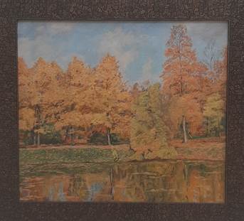 «Осенняя пора» Вячеслава Романова – триумф «пышного природы увяданья», когда раскрыта каждая веточка, каждый листок, среди золотых крон едва виднеются потемневшие стволы, парк торжествует, отражаясь в воде, разделенный от неё столь же живописной полоской берега.