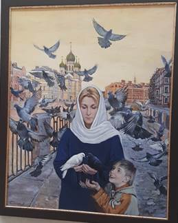 Как прост сюжет картины Людмилы Бирюковой «Радость бытия» и как многозначен он. Мать с сыном на мосту на фоне храма кормят голубей. Мама-то понимает, как важно передать сыну чувство сопричастности и заботы о птицах, о тех, кто рядом, кто наполняет нашу стремительную жизнь незатейливым воркованием и не дает забыть посмотреть на небо, увидеть высокий полет. Мама – образ мадонны, мальчик весь распахнут в тихой радости, но в то же время он под сенью материнских рук, её чистого белоснежного покрова, защиты. Полотно «Радость бытия» можно рассматривать бесконечно, столько в нем символов: и окна - порталы в неведомое, и брусчатка моста - твердь, опора, и сфера, распахнутая крыльями голубей, вольный простор душе в густонаселенном городе.