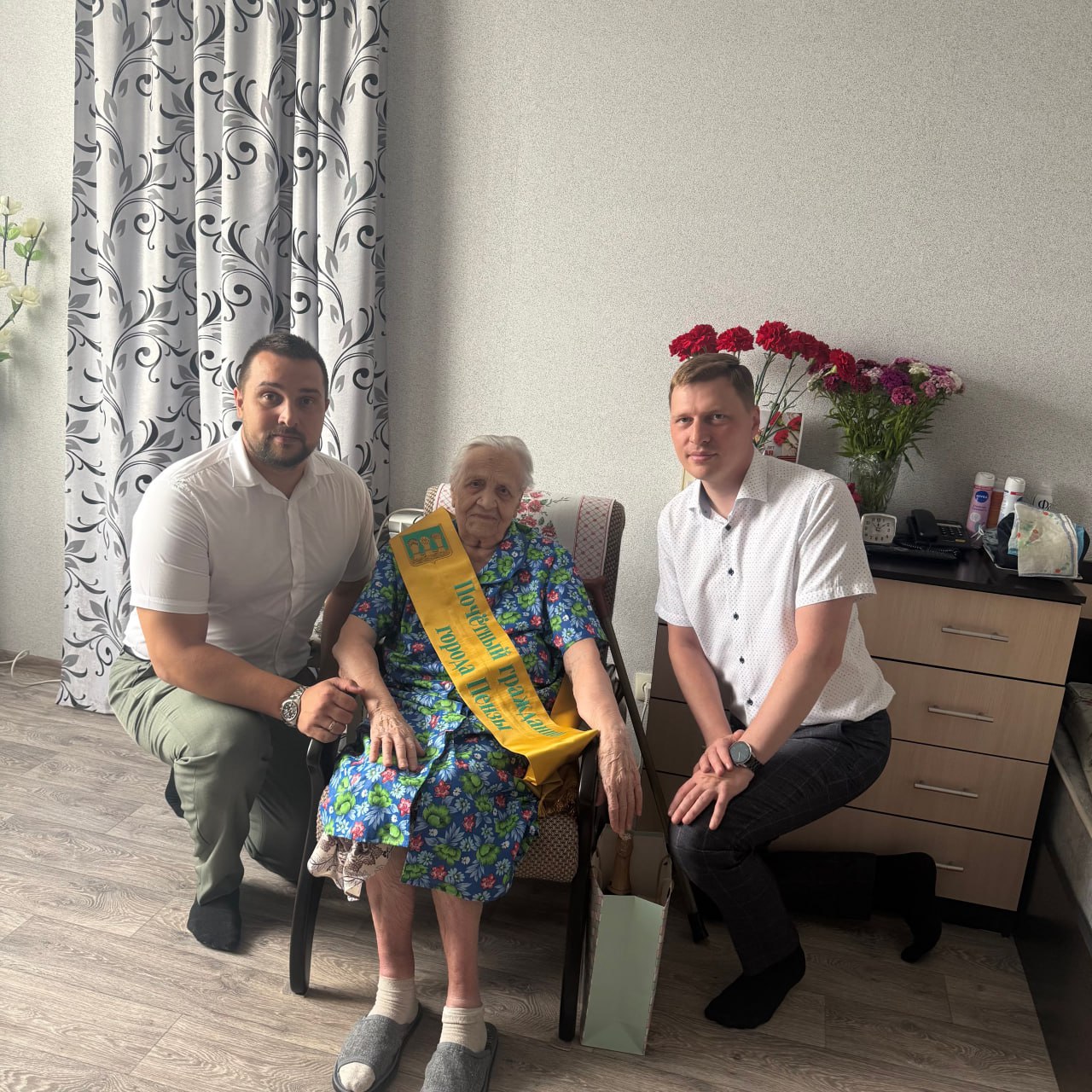 Юбиляра лично поздравили депутат гордумы Владимир Обухов и глава администрации Октябрьского района Артем Садовов, вручив цветы, подарки и пожелания здоровья и радости. Визит гостей в день векового юбилея стал знаком глубокого уважения и признательности Александре Матвеевне за ее неоценимый вклад в Победу и послевоенное восстановление страны.