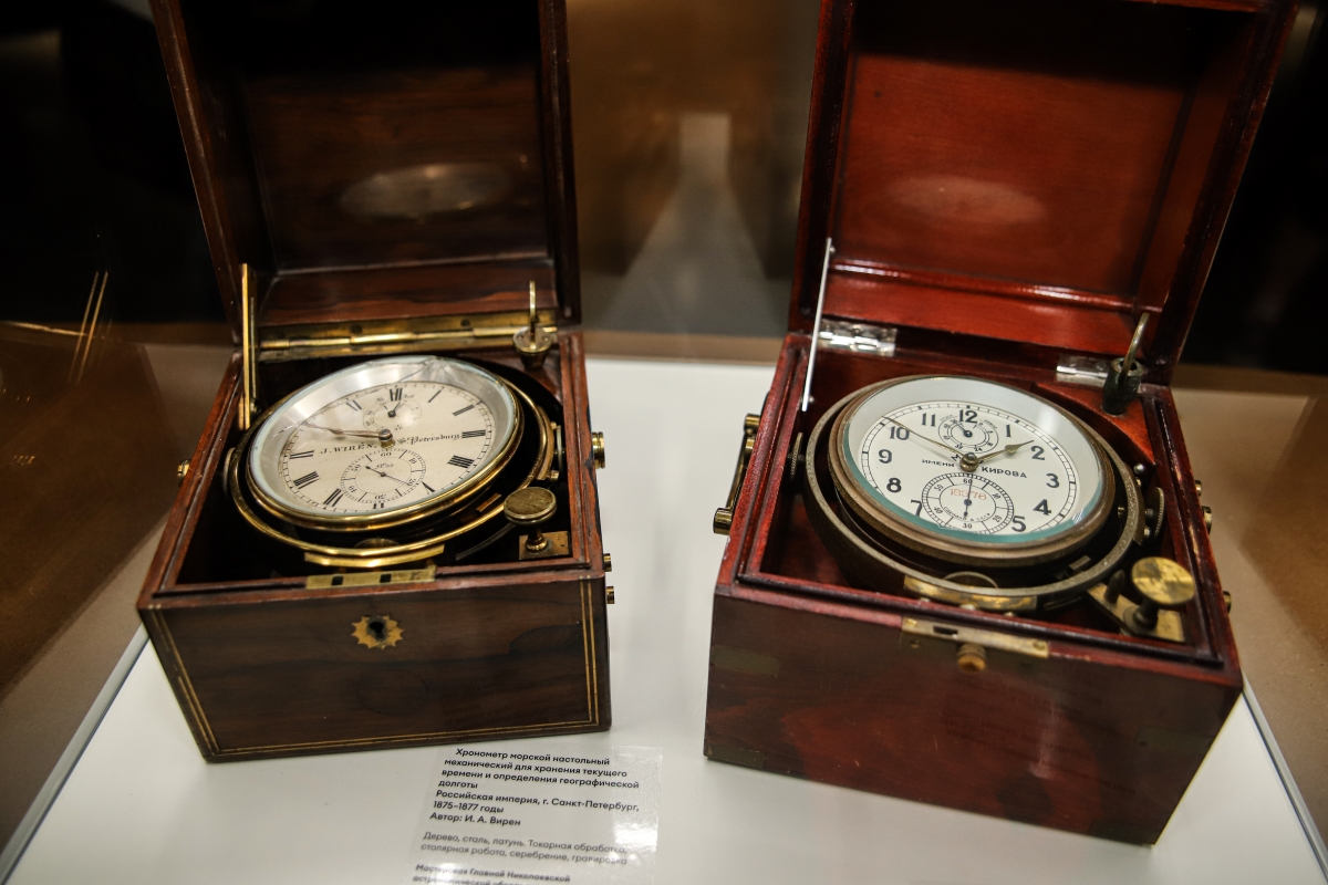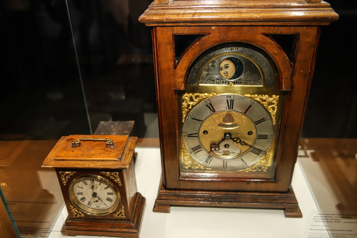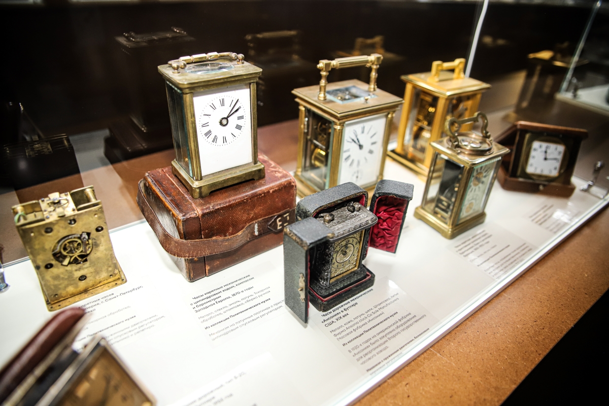 Политехнический музей представил экспонаты, по которым можно проследить историю развития часовых механизмов: механизмы с турбийоном, маятниковые часы с гиревым приводом, электрические модели середины прошлого века и механизм башенных часов Ленинградского вокзала. Среди раритетов Исторического музея — каминные и настольные часы. Кроме того, Музей современной России представил солнечные часы, морские хронометры, редкие карманные часы революционеров, политиков и ученых.
