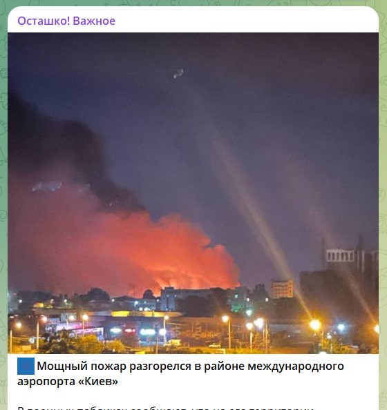 Украинцы сами активно публикуют фотографии из объятого пожарами Киева. Раздался взрыв и загорелось общежитие авиационного университета, использовавшееся как казарма ВСУ. Полыхает ещё в нескольких районах. Со стороны международного аэропорта в Киеве поднимается яркое пламя и столбы дыма – ударили и туда.