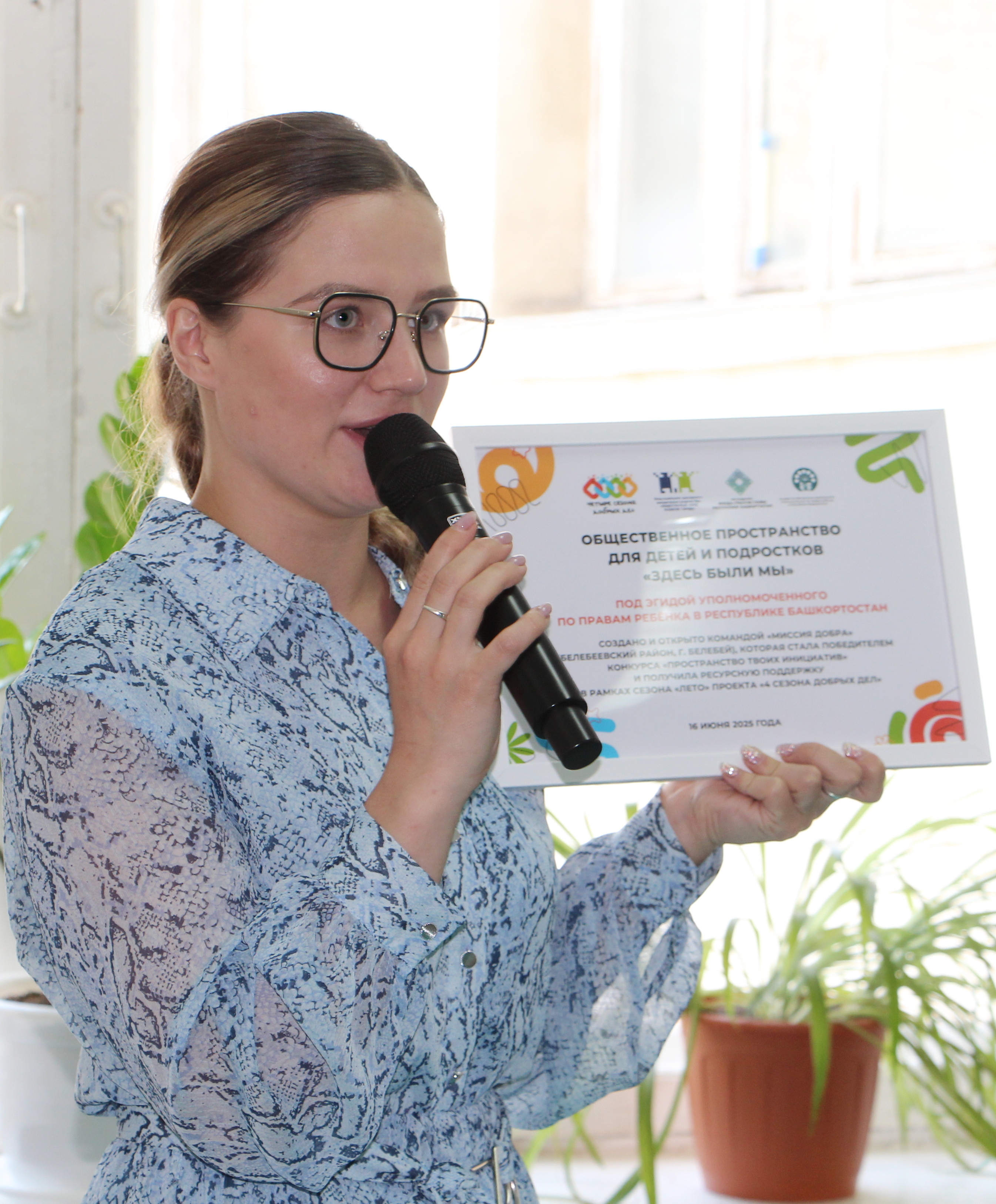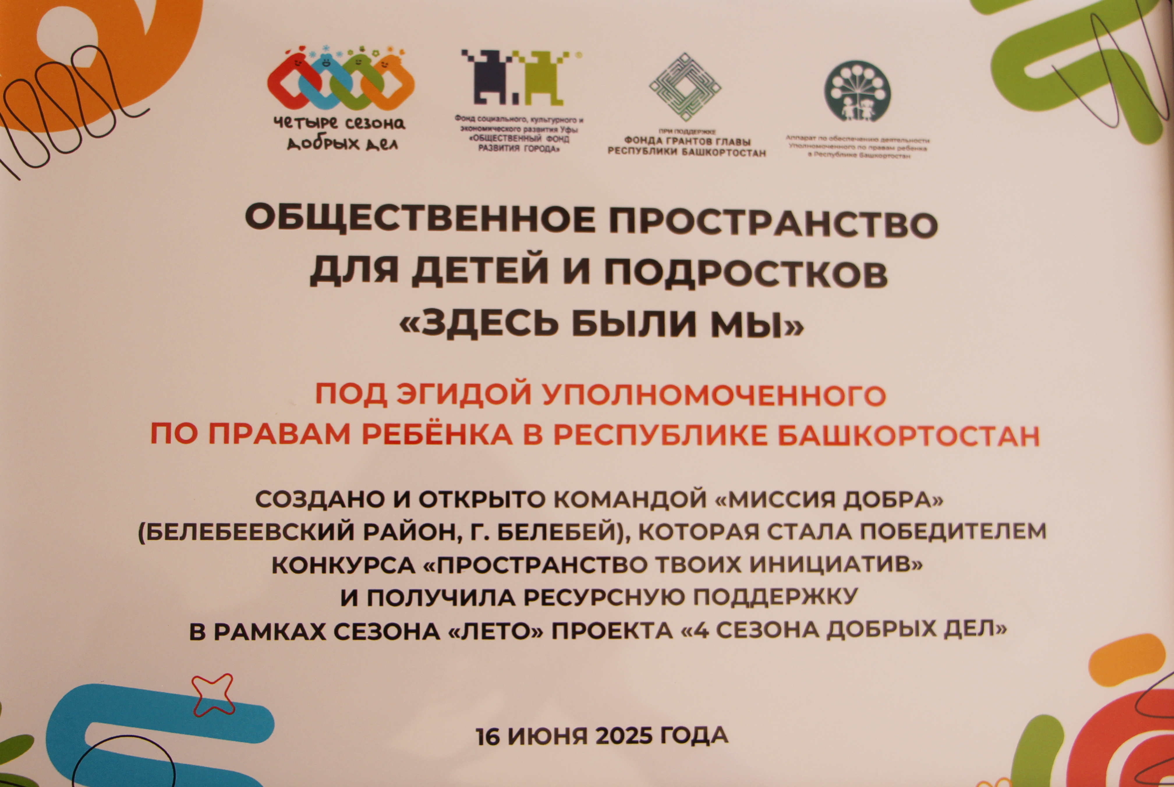 Открытие детского общеобразовательного пространства «Здесь были мы» стало возможным благодаря проекту «Четыре сезона добрых дел», который реализуется общественным фондом развития города при поддержке Аппарата Уполномоченного по правам ребенка в Республике Башкортостан на грант Главы РБ и Фонда грантов РБ. Этот проект направлен на создание условий для всестороннего развития детей и поддержку их инициатив.