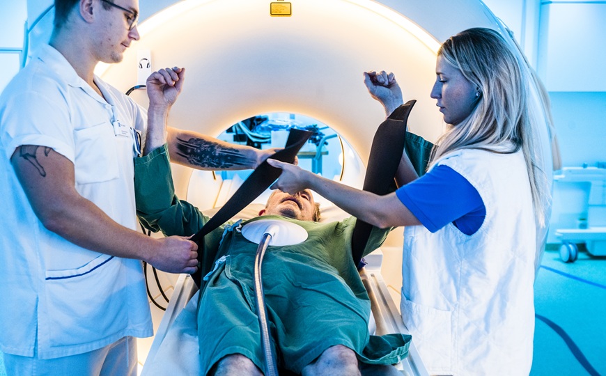 Для измерения рубцевания печени пациента с помощью магнитно-резонансной томографии над печенью закрепляется вибромотор. Чем больше рубцов, тем быстрее движение волн в печени.
