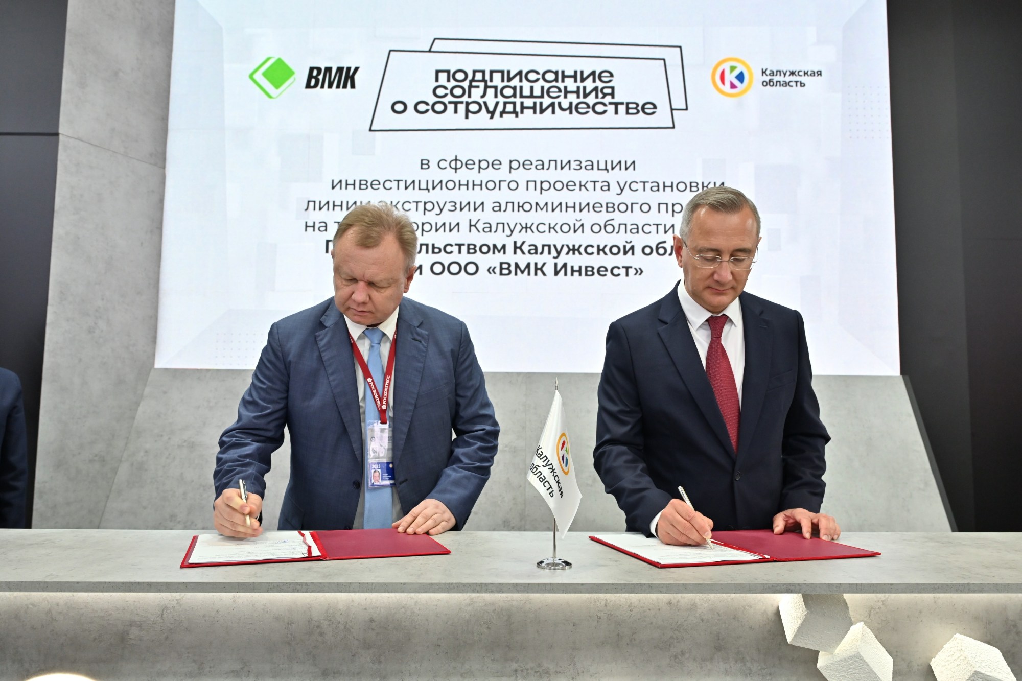 19 июня в рамках XXVIII Петербургского международного экономического форума губернатор Владислав Шапша и директор «ВМК Инвест» Владимир Шершнев подписали два соглашения о сотрудничестве. Первое касается строительства производственного цеха изготовления матричного инструмента для алюминиевой экструзии, а второе – установки линии экструзии алюминиевого профиля.