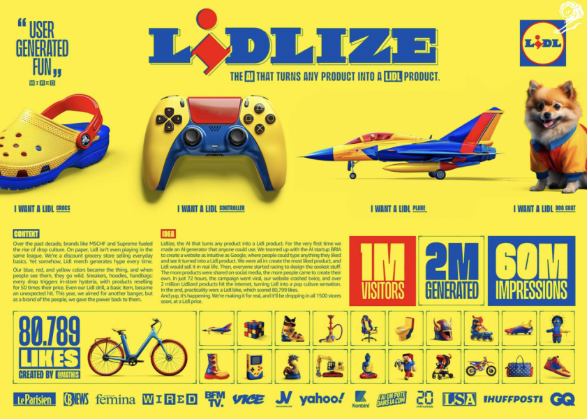 Когда мерч супермаркета становится поп-культурным феноменом, следующий шаг — передать инициативу поклонникам. Так родился Lidlize — AI-инструмент, с помощью которого кто угодно мог превратить любой предмет в потенциальный хит от Lidl. Хочешь тостер, кроссовки, фен или будильник в цветах Lidl? Вводишь идею — генеративная модель от стартапа BRIA мгновенно создаёт реалистичную яркую визуализацию.