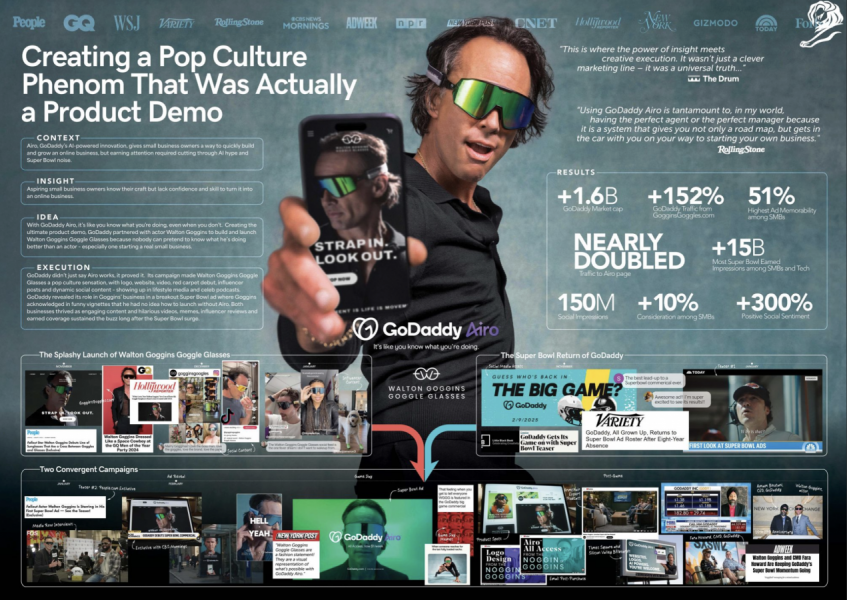 Чтобы вернуться на арену Супербоула, GoDaddy выбрал героя — актёра Уолтона Гоггинса, который запустил бизнес очков для подводного плавания — Walton Goggins Goggle Glasses. За проектом стоял Airo — новый AI-инструмент, помогающий предпринимателям создавать бизнес за считанные часы, даже если они ничего в этом не понимают.