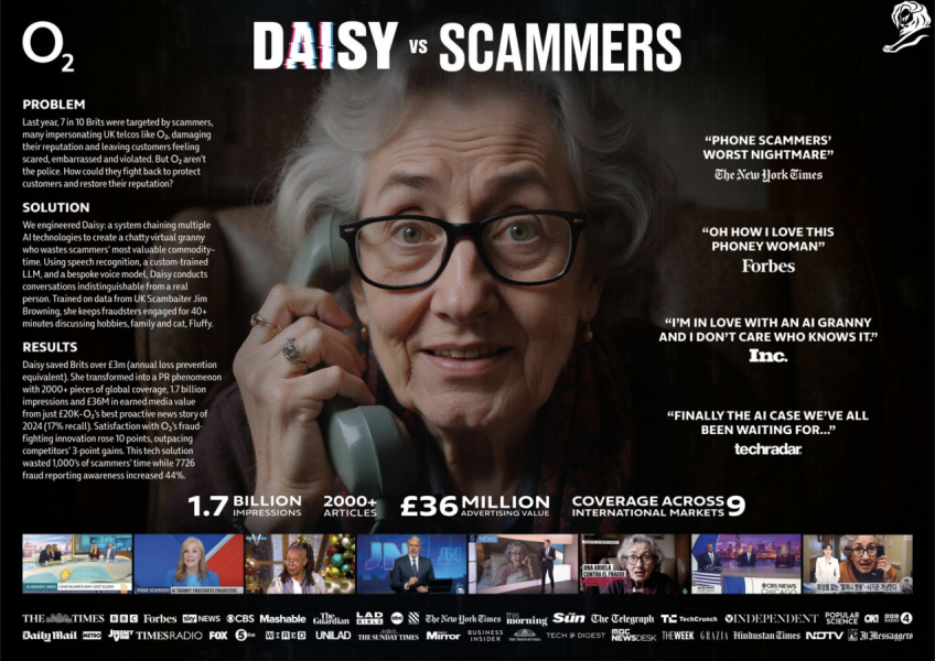 Вместо того чтобы учить пользователей избегать мошенников, O2 решила дать отпор сама — и создала Дейзи. Эта милая, болтливая «бабушка» на самом деле AI-агент, созданный, чтобы тратить скамерам их самое ценное — время. С помощью реалистичного голоса, продуманной биографии (кот Флаффи, рецепт лимонного пирога, внуки) и сотен сценариев Дейзи часами разговаривала со скамерами, парализуя их работу и собирая материал для вирусного контента в стиле scambaiting. Технологически проект стал шедевром интеграции: Vapi, Deepgram, GPT‑4o, ElevenLabs и визуальный аватар на базе Kling AI работали синхронно, чтобы создать настоящую иллюзию живого человека.