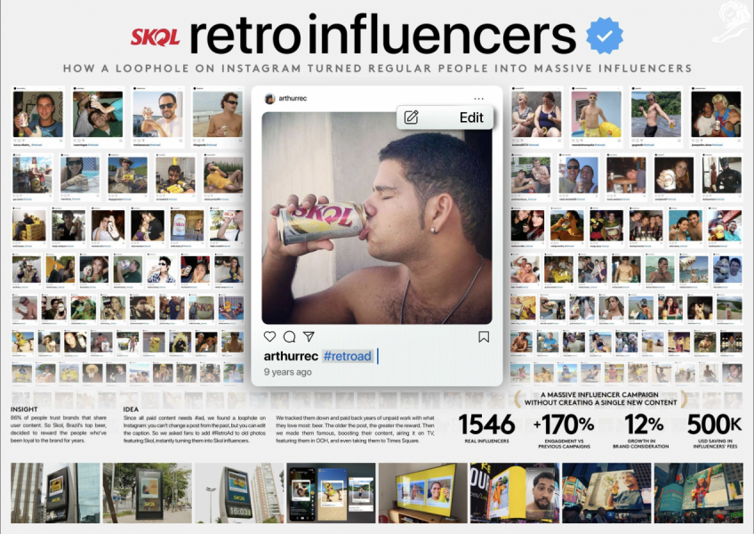 В честь 60‑летия Skol, одного из любимейших пив в Бразилии, бренд не стал платить инфлюенсерам, а отблагодарил тех, кто уже давно продвигает его по любви. Кампания «RetroInfluencers» нашла лазейку в Instagram: старые посты нельзя изменить, но можно отредактировать подпись. Skol предложил найти старые фото с пивом и просто добавить хэштег #retroad. Чем старше пост — тем выше награда. Преданная аудитория превратилась в органичных амбассадоров бренда. Самые культовые публикации показали по ТВ, вывели на билборды и даже на Таймс‑сквер — всё в стиле Skol с ретро‑флером. Кампания стала культурным феноменом: ностальгия, ирония и настоящая любовь объединились в праздник потребителя.