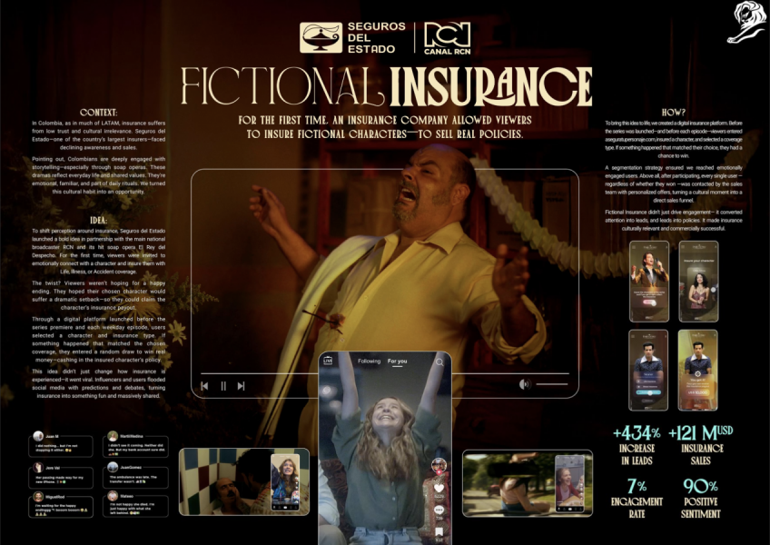 В Колумбии люди с жаром обсуждают судьбы героев телесериалов, но с равнодушием относятся к страхованию в реальной жизни. Seguros del Estado использовала этот культурный парадокс — и внедрилась в сериал El Rey del Despecho. Зрителям предложили застраховать вымышленного персонажа: жизнь, болезнь, несчастный случай — через цифровую платформу. Если в эпизоде происходило застрахованное событие — участник получал шанс выиграть реальные деньги.