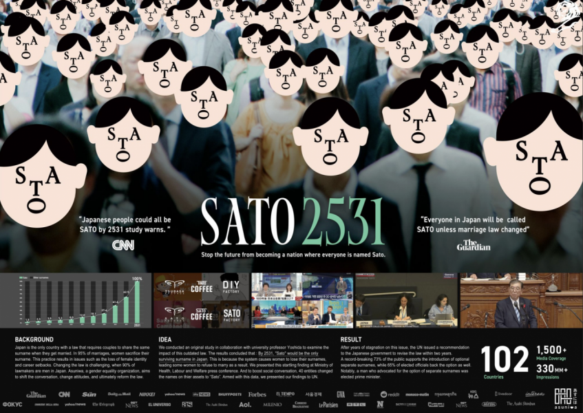 Кампания стартовала как научная презентация и быстро охватила всю Японию: 40 брендов, музыканты, спортивные клубы и упаковки продуктов сменили имя на Sato. Все спрашивали: почему? Ответ разместили на сайте: устаревший закон уничтожает разные фамилии и женскую автономию. Работа дошла до ООН и заставила правительство пересмотреть свою позицию.