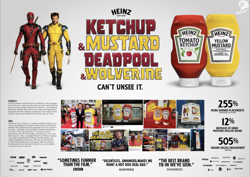 Летом 2024 года весь мир ждал выхода «Deadpool & Wolverine», и именно тогда HEINZ понял: на экране мы увидим не просто супергероев, но и идеальный дуэт кетчупа и горчицы. Красный костюм Deadpool и жёлтый — Wolverine выглядели как культовые бутылки HEINZ, и интернет уже это обсуждал. Вместо обычного партнёрства бренд запустил трейлеры, наружку и digital‑активации, которые сначала выглядели как промо фильма, а затем неожиданно оборачивались рекламой HEINZ.
