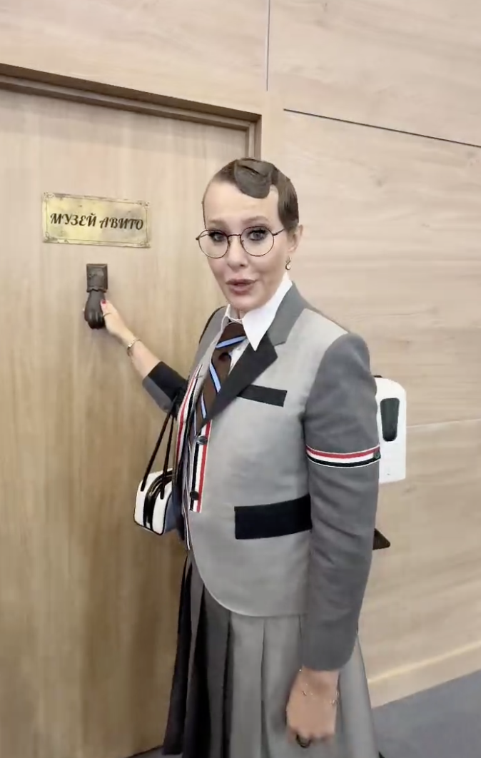 В ключевой день ПМЭФ удивила и Ксения Собчак, появившаяся в наряде, который напоминал о пресс-конференции президента в конце 2024 года. Она выбрала серый пиджак, белую полосатую рубашку и бордовый галстук, схожий с тем, который носил президент. Ксения Анатольевна отдала предпочтение костюму американского бренда Thom Browne.