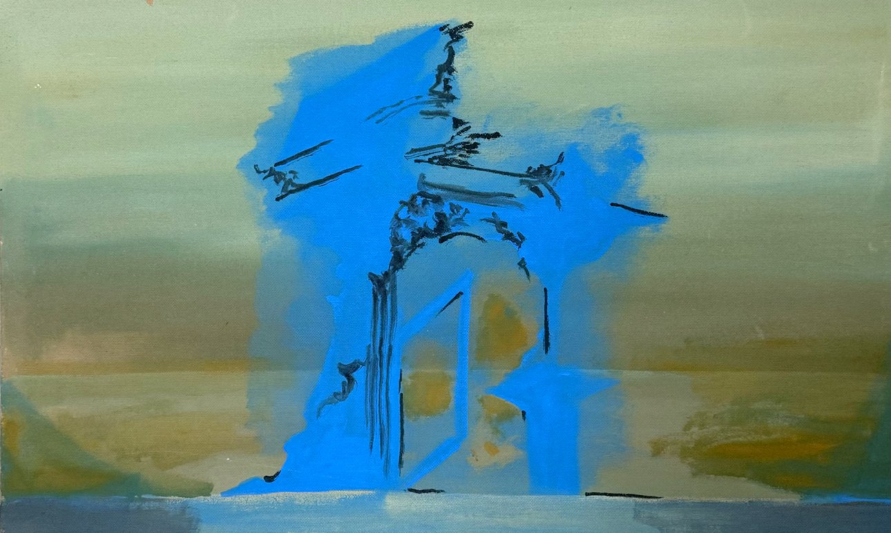 На втором этаже представлена крупноформатная живопись последних лет и графика 2010-х, тематически связанная с образами выставки — «Башней» и «Домом художника». Кстати, о башне. Что за странная фраза в цитате из Набокова — «из дактиля в дактиль»? Перед нами характерный для писателя трюк: и название рассказа (а также, соответственно, выставки), и сам этот фрагмент написаны дактилем — трехдольным размером античной метрики: «Высилась прямо из дактиля в дактиль старинная черная башня…» Сквозь прозу Набокова загадочно просвечивают стихи — и, кажется, подобным образом материальный субстрат, к которому прикасается рука художника, стремится приобщиться к идеалу.