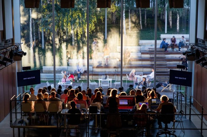 С 17 июня по 27 июля в театральной программе пространства Дома культуры «ГЭС-2» вновь появились показы спектакля Дмитрия Волкострелова «Закат», премьера которого состоялась в июле 2024 года. Главная особенность летней постановки в ее двумерности: пространство спектакля разделено надвое. Зрители находятся в здании «ГЭС-2», а актеры – в Роще, за стеклянной стеной Актового зала.