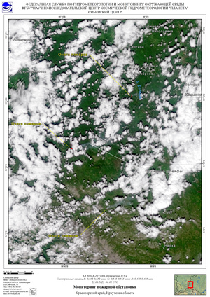 На спутниковых снимках прослеживаются горящие кромки пожаров, значительные выгоревшие территории, наблюдаются протяженные дымовые шлейфы. Некоторые очаги возгораний действуют в непосредственной близости от границ населенных пунктов.