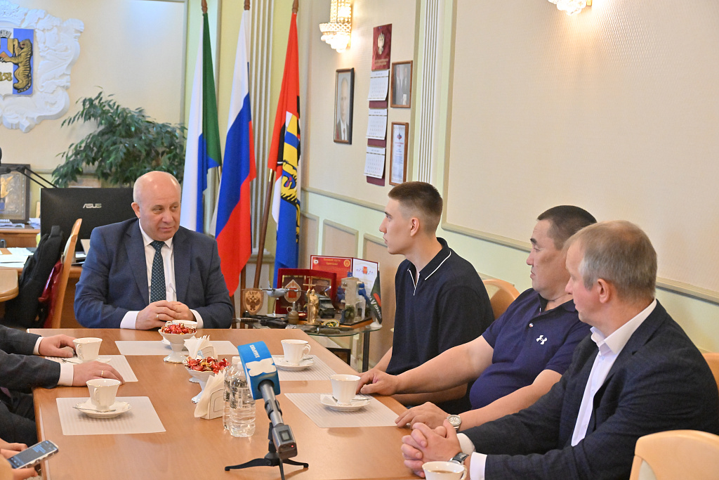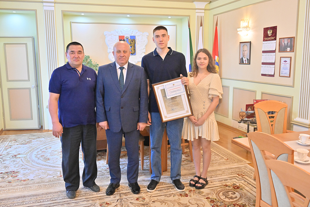 Мэр краевой столицы вручил почетную грамоту и подарок победителю первенства России по боксу Алексею Гукову.