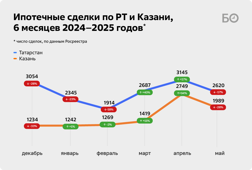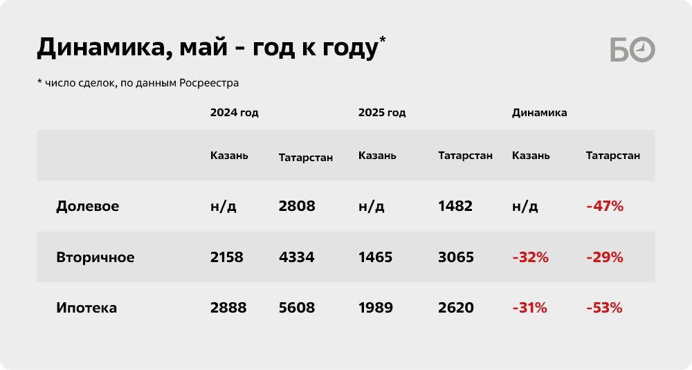 Ярко выглядит спад по сравнению с маем 2024-го. Тогда общее количество сделок по Татарстану составляло 6,4 тыс., за год количество договоров купли-продажи упало почти в 1,5 раза.
