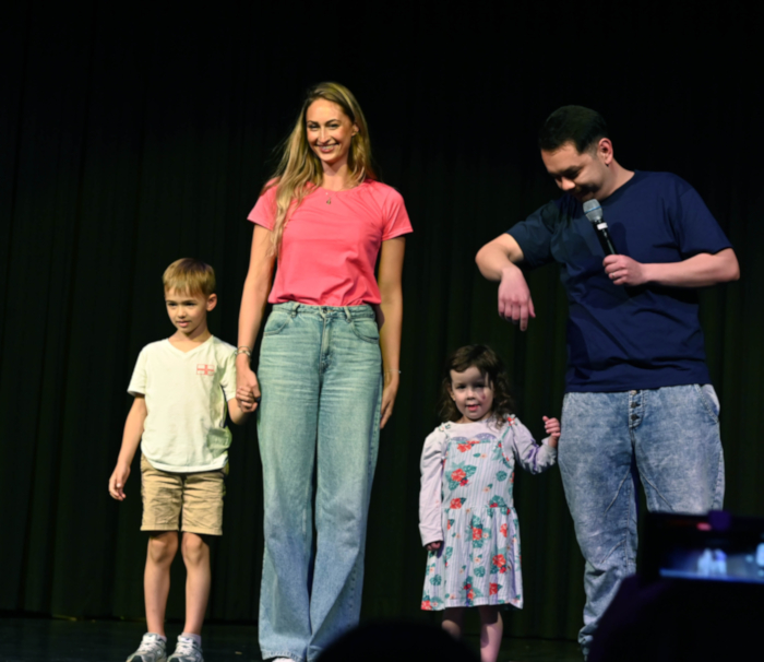 А вот и первый подарок всем присутствующим: видеофильм, созданный Фото- и видеостудией «ИСТОК» (руководители Федор Давыдович Шван и Олег Гришин). Выше уже говорилось о том, что, придя в «ИСТОК», люди в нём остаются! Семья Гришиных пример тому: вот они все на сцене после показа фильма: мама Юля, папа Олег, дочери Маша и Настя читают проникновенное стихотворение об «ИСТОКЕ», написанное главой семьи.