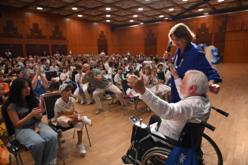 Уже появление на сцене первой пары ведущих вызвало самые добрые эмоции – Элеонора Шван и Алевтина Померанец. Эля, первая выпускница школы 2014 года, и Аля, выпускница 4 класса 2025 года.