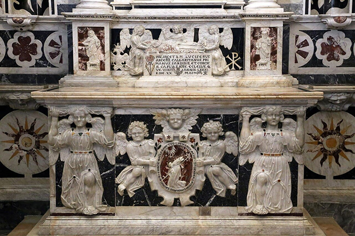 Деталь алтаря в часовне Святого Люцифера с надписью, указывающей местонахождение его мощей. / Фото: Wikimedia Commons