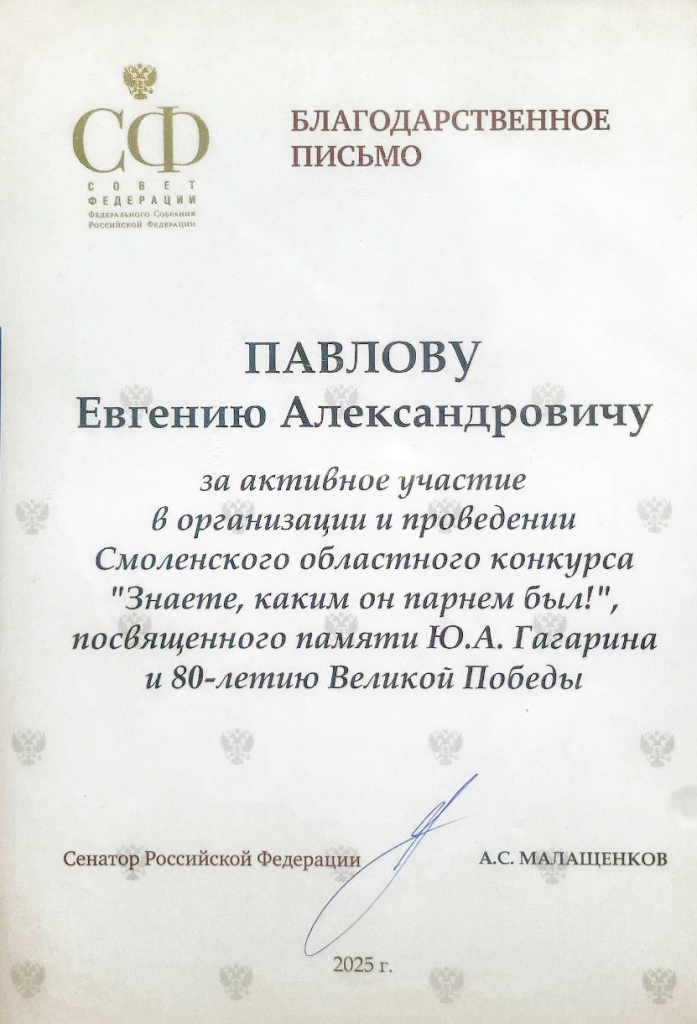 Депутат Смоленского городского Совета Евгений Павлов получил благодарность от Совета Федерации Федерального Собрания Российской Федерации за участие в организации и проведении областного турнира по микрофутзалу «Знаете, каким он парнем был!».