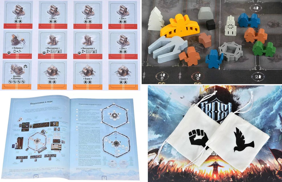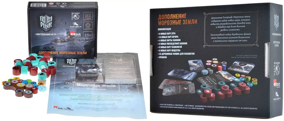 Коробка с Frostpunk содержит генератор с поддоном высотой 200 мм, фрагмент генератора, улучшение генератора, планшеты генератора, надежды и недовольства, запаса, раундов и утра, населения, зданий и вечера, 12 фрагментов рубежа, мешочки недовольства и надежды, 30 фрагментов поля, пять фрагментов скал, четыре листа советников, 199 больших карт, 107 средних карт, 148 маркеров, 162 токена, книгу сценариев и правила игры.