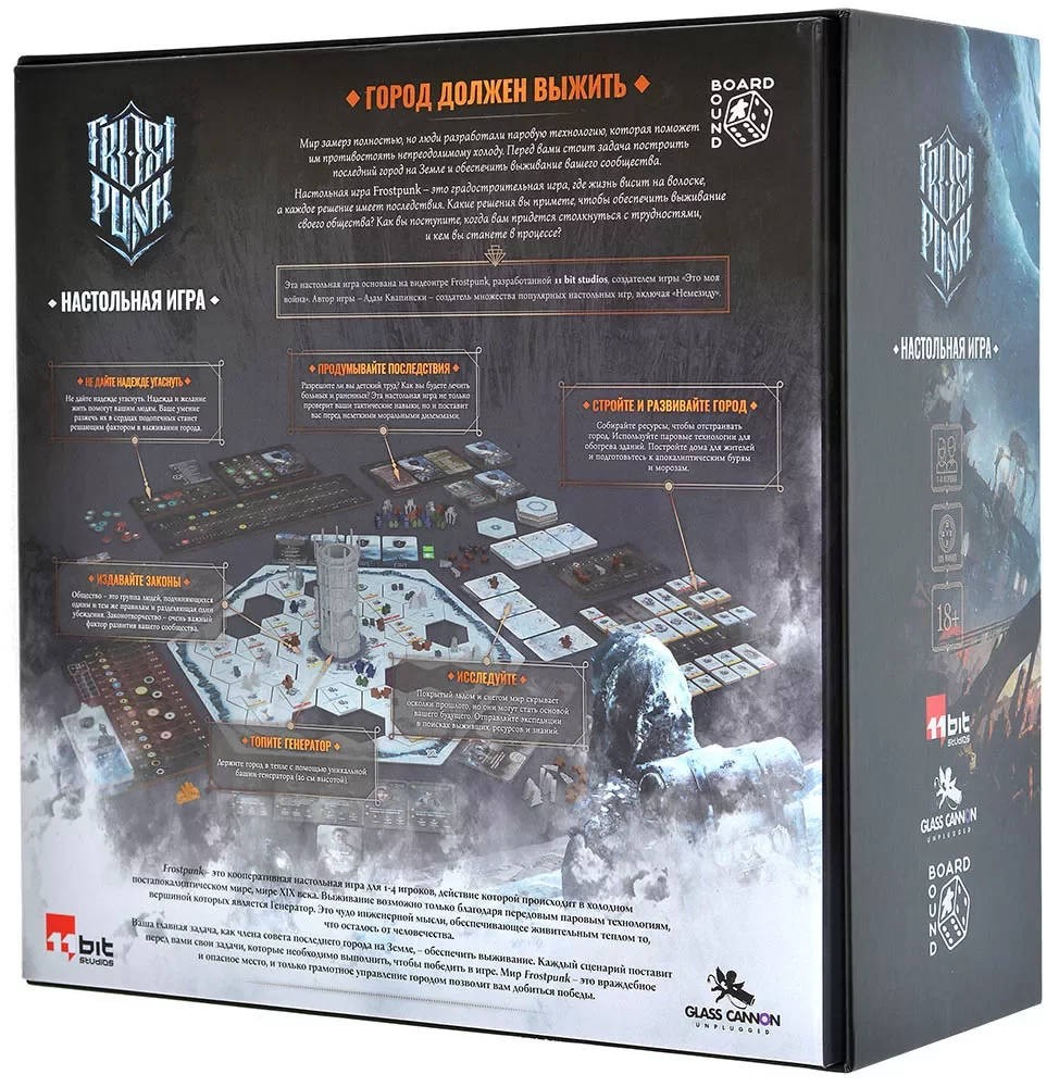 Пришло время добавить в свою коллекцию русскую версию настолки Frostpunk вместе с дополнением «Морозные земли», в которой игрокам надо будет всячески улучшать тепловой генератор в городе, разбираться с ежедневными проблемами людей и принимать непростые решения, чтобы выжить в замерзшем мире.