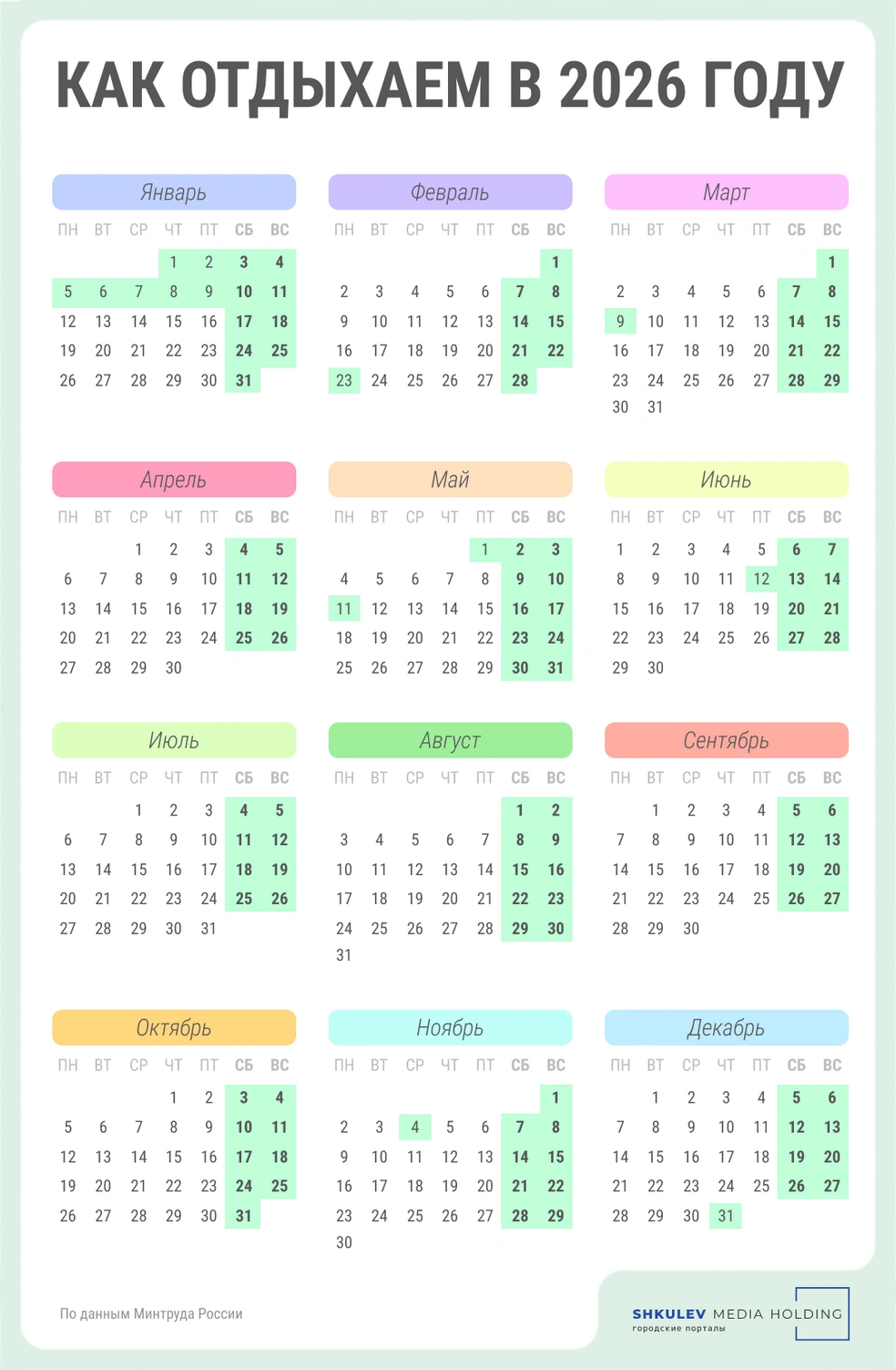 Минтруд разработал проект календаря праздничных и выходных дней на 2026 год. Проект постановления размещен на общественное обсуждение.