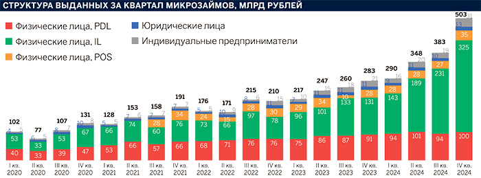 В целом, на конец 2024 года общий долг граждан перед МФО, включающий в себя IL-займы, «займы до зарплаты» (Pay day loans, PDL), микрозаймы на покупку товаров (Point of sale, POS), а также займы самозанятым, составил 523 млрд рублей, увеличившись по сравнению с 31 декабря 2023 года на 44,7%. Это максимальный рост за всю историю наблюдений (с 2015 года). Портфель микрозаймов бизнесу (индивидуальным предпринимателям и юридическим лицам) вырос на более скромные, но все равно весьма внушительные 23,6% (до 101 млрд рублей).