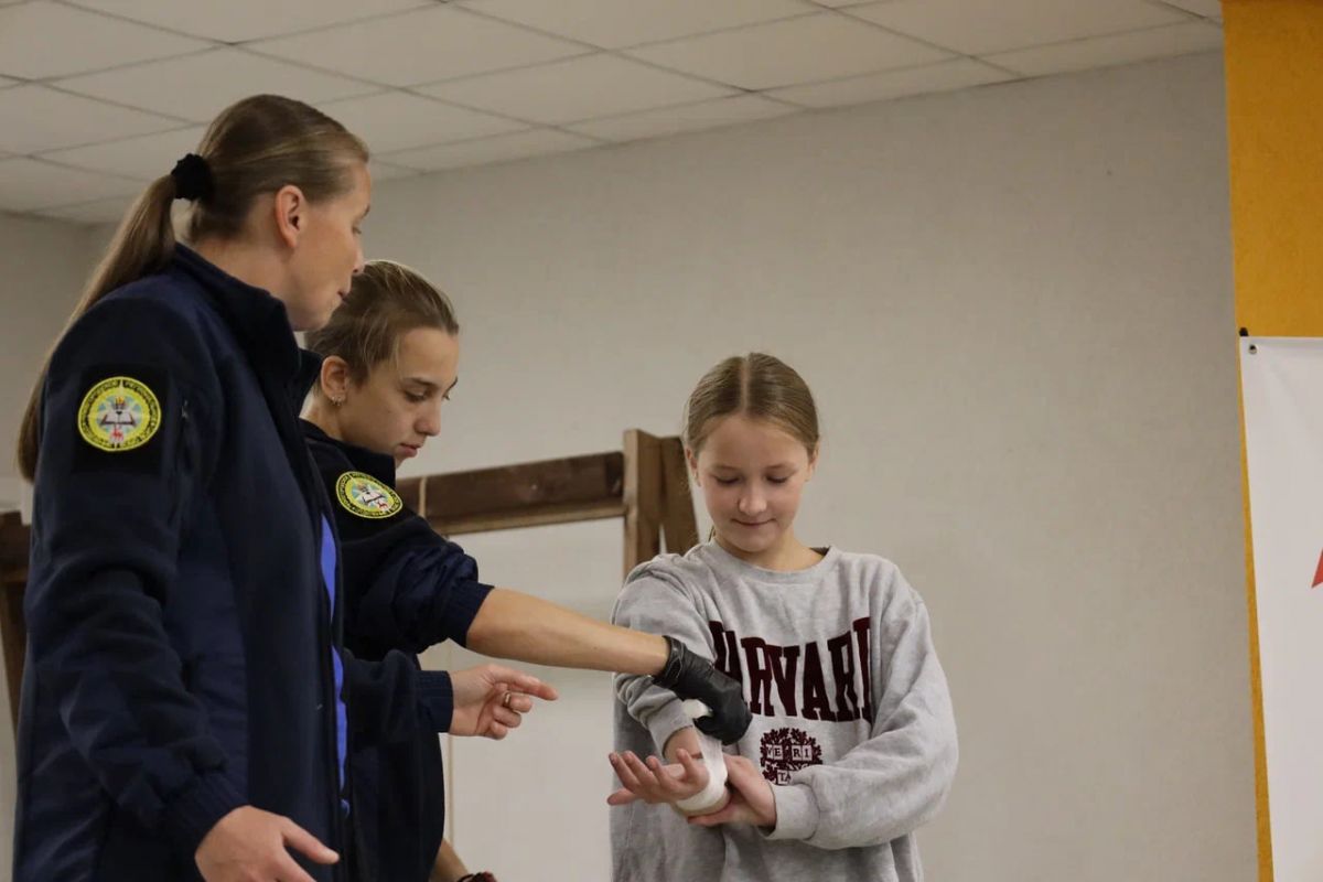 Руководитель Нижегородского реготделения Всероссийского студенческого корпуса спасателей Елена Дрягалова научила подростков, что делать при остановке дыхания и попадании инородных предметов в дыхательные пути, показала, как останавливать артериальные и венозные кровотечения, проводить сердечно-лёгочную реанимацию.