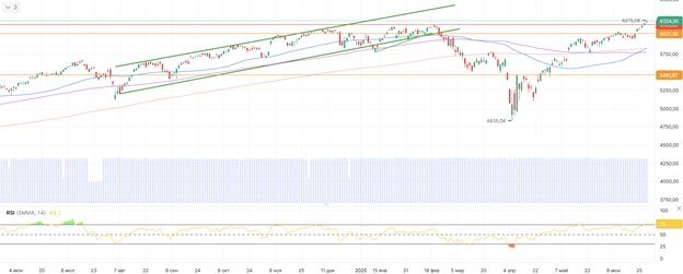 Индекс S&P 500 обновил исторический максимум, однако не смог закрепиться выше отметки 6 200 пунктов. Согласно индикатору RSI, рынок находится в зоне перекупленности, что повышает вероятность краткосрочной коррекции. В случае снижения ближайшим уровнем поддержки может выступить область около 6 030 пунктов.