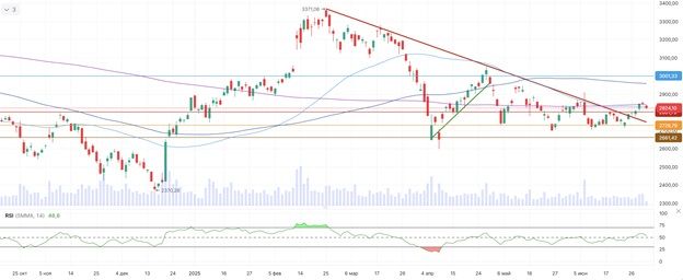 Российский индекс на прошлой неделе сумел преодолеть многомесячный нисходящий тренд, однако не смог закрепиться выше 50- и 200-дневных скользящих средних, что может служить сигналом к началу коррекции. Ближайшую поддержку индекс может найти в районе 2 800 пунктов.