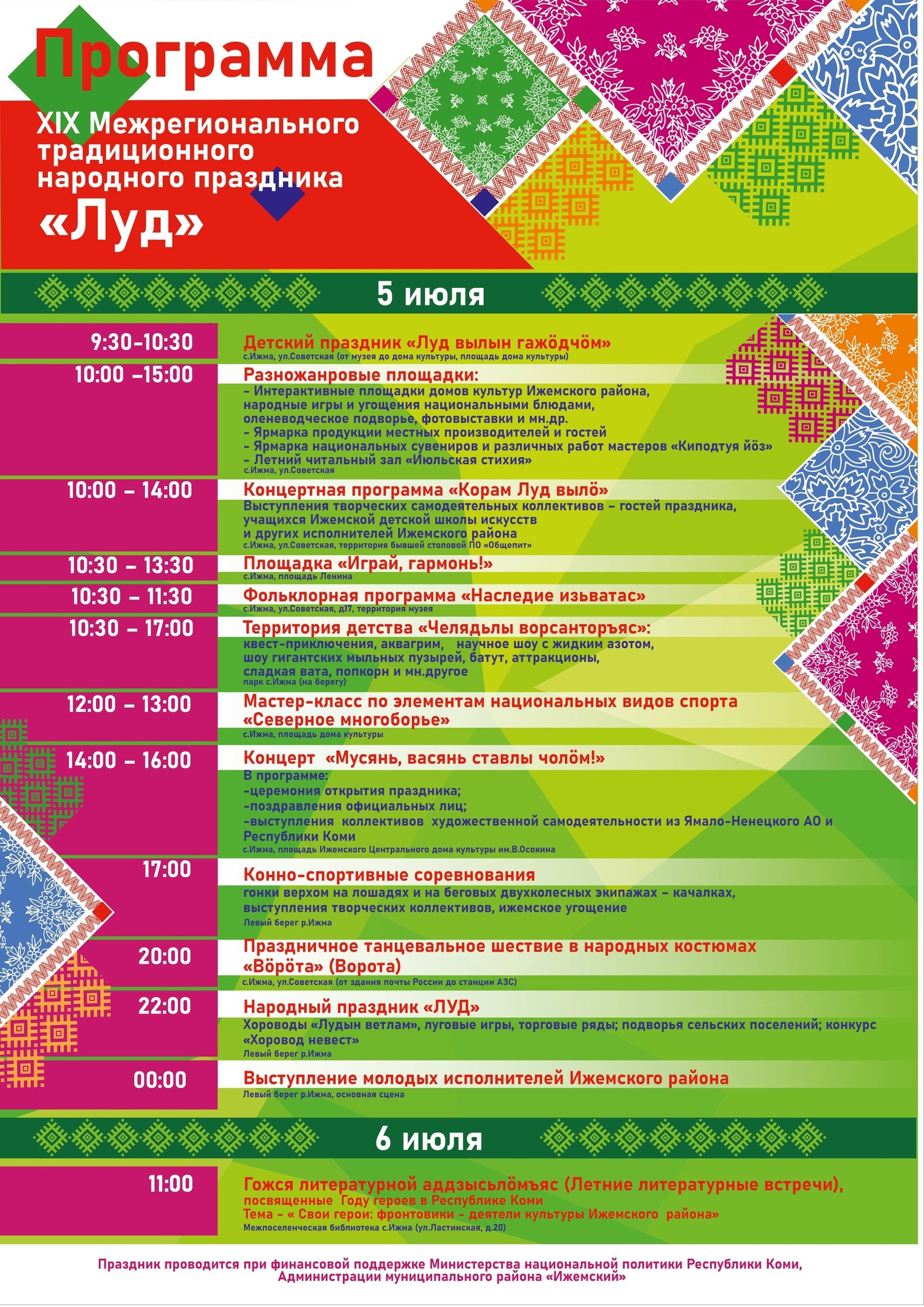 Откроется «Луд» в 09:30 с детского праздника «Луд вылын гажӧдчӧм» («Праздник на Луде»). В 10:00 откроются гостевая концертная площадка и ряд других разножанровых площадок: выставки, мастер-классы, ярмарки, читальный зал, народные игры и другие развлечения.