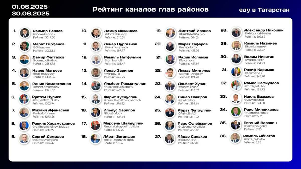 Лидером по активности сталРадмир Беляев, руководитель исполкома Нижнекамского района РТ, чей канал набрал впечатляющие 3517,05 балла, что значительно выделяет его среди коллег.