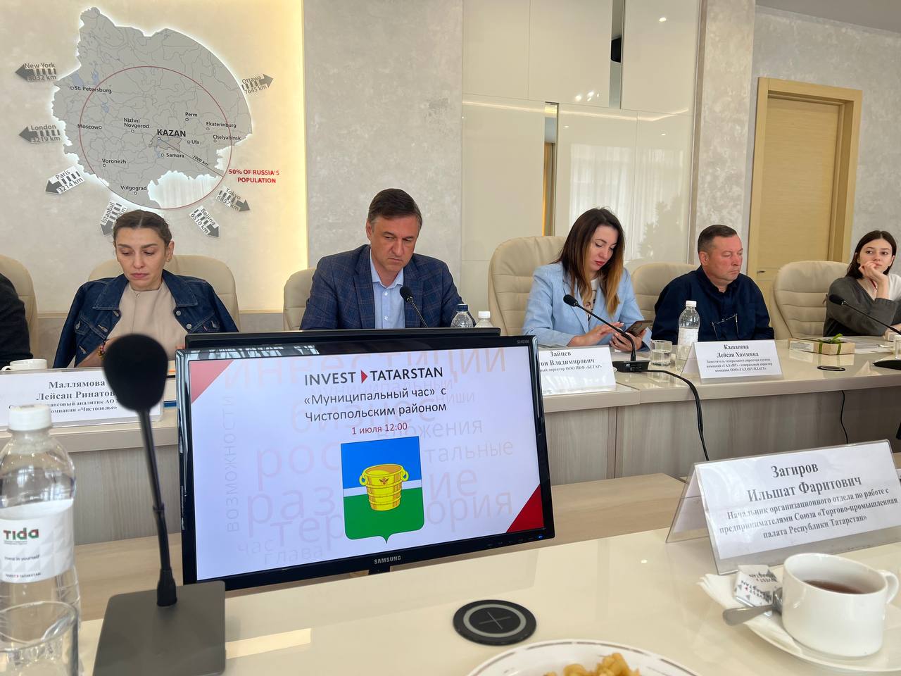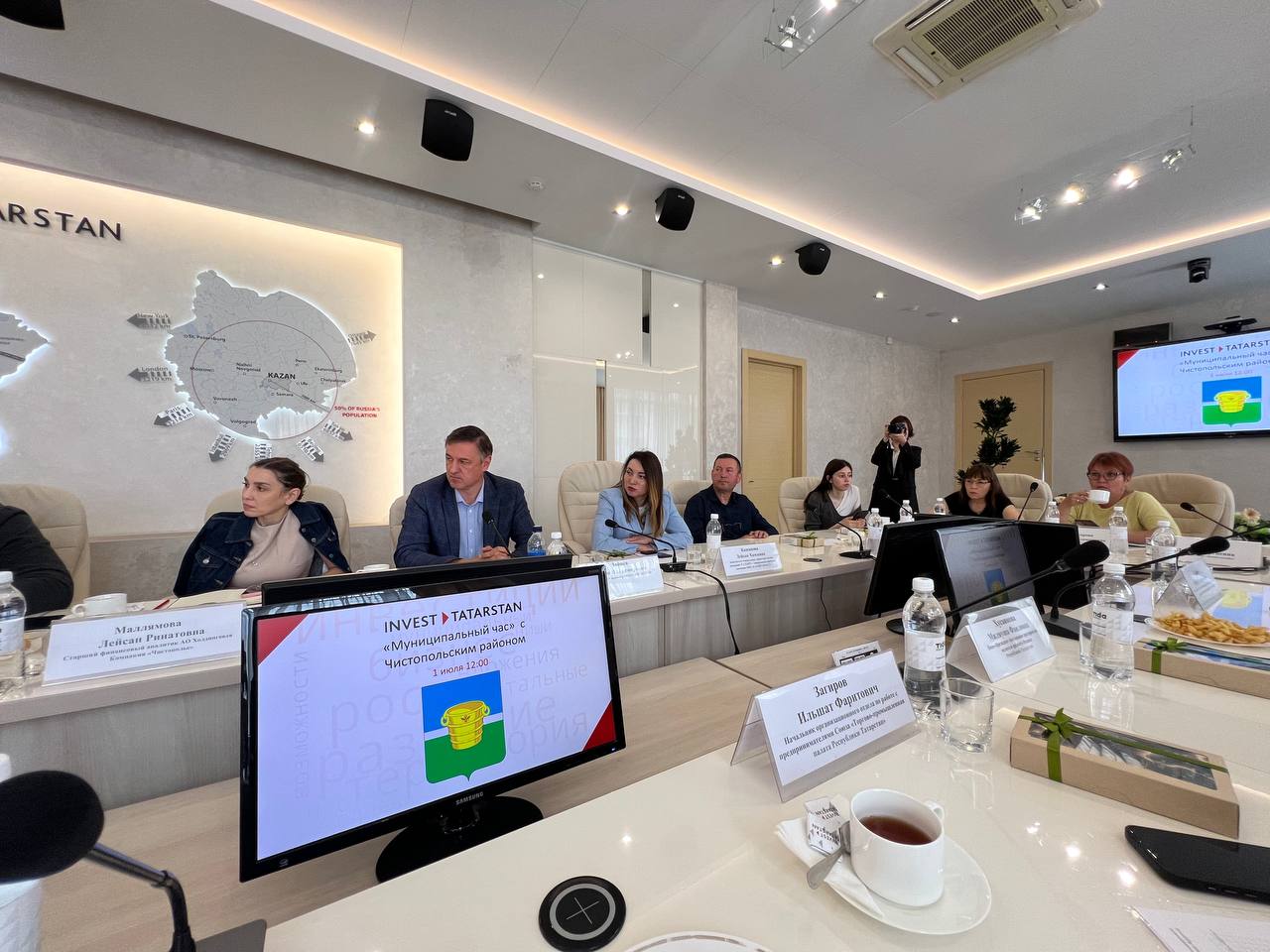 «Муниципальный инвестиционный час» прошел с участием главы района Дмитрия Иванова, представителями Управления Раиса РТ, Министерства экономики, земельных и имущественных отношений, сельского хозяйства и продовольствия, промышленности и торговли РТ, других республиканских органов власти и деловых объединений в Агентстве инвестиционного развития Республики Татарстан.