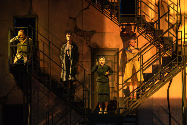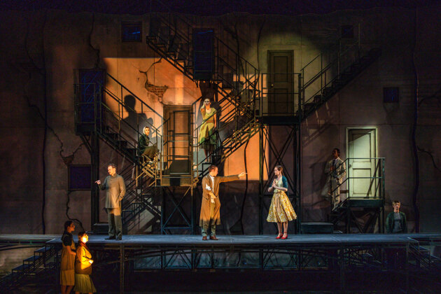 И никаких наград за муки – ни Родиону, ни совестливой Соне. Вместо морализма – релятивизм. Во сне всё относительно, всё условно и переменчиво. Время и место – тоже. Некий Питер нигде и везде, никогда и всегда – простодушно некрасивый город-фантом, где в уличном шуме вперемешку цокот пролёток, рокот автомобилей, патефонные хиты 1930-х и полицейские сирены. Толпа персонажей, одетая в средне-арифметическое 1930-х и 60-х, движется вдоль обшарпанного фасада с хаотичной грацией босховской живности. Тут указательные пальцы стреляют с грохотом настоящего пистолета, а все уста невпопад выкрикивают пронзительное “А!!!” на манер злых невских чаек (всех, кто был в Петербурге, очень впечатляют эти водные коллеги ворон – от изящного МХАТовского маскота они конфузно далеки).