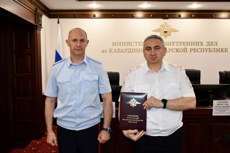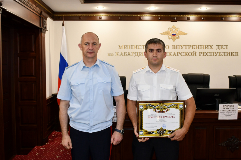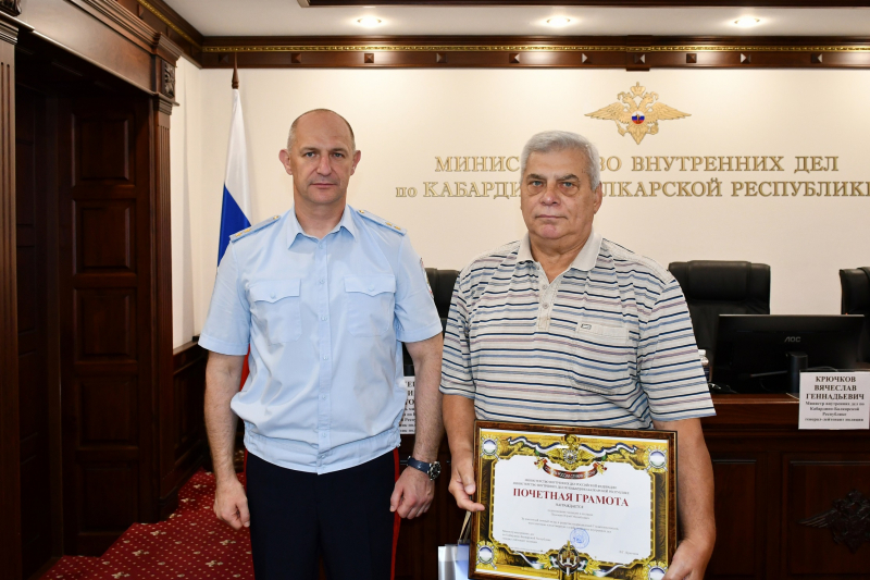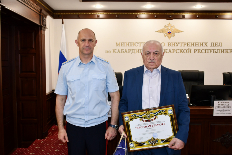 Приветственный адрес из рук генерал-лейтенанта полиции Вячеслава Крючкова получил начальник Управления Госавтоинспекции МВД по КБР полковник полиции Юрий Бегидов.