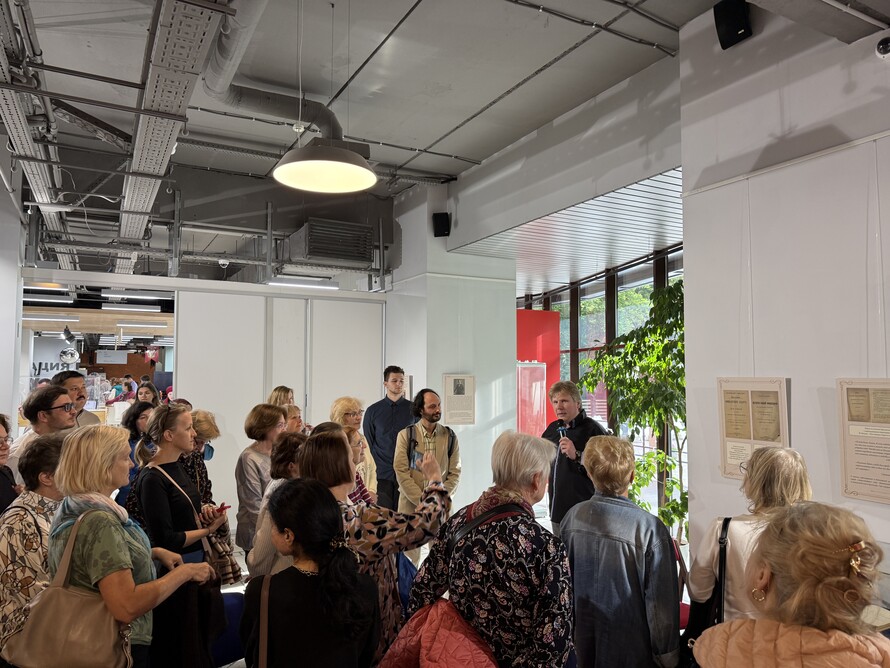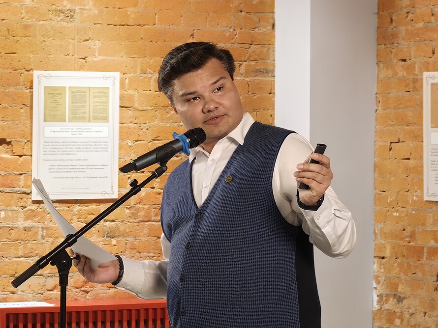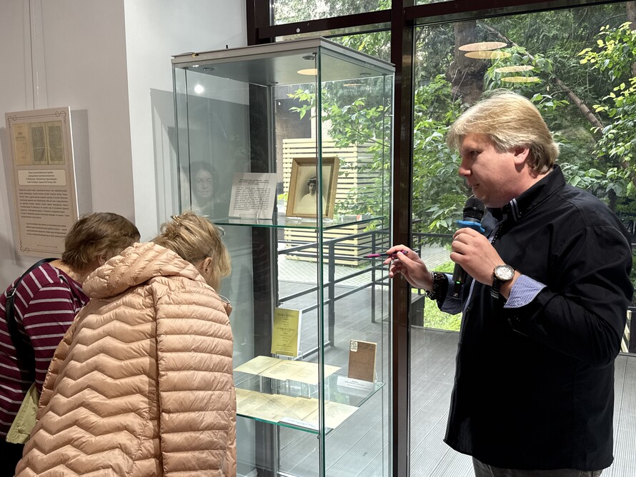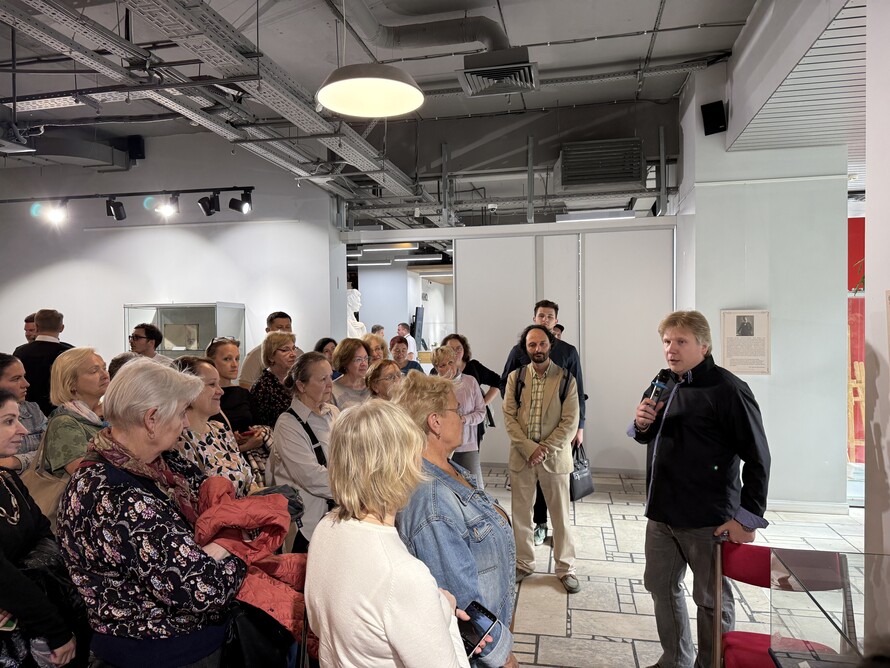 После церемонии открытия выставки кураторскую экскурсию гостям провел заведующий отделом научной работы Мемориального музея А. Н. Скрябина Владимир Попков.