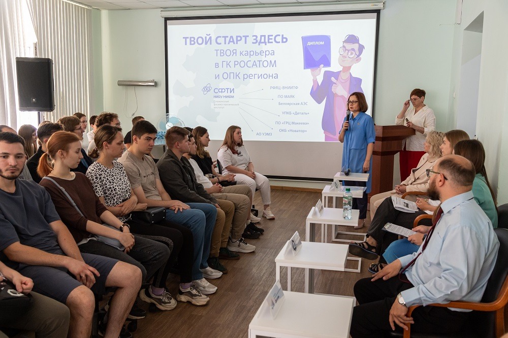 Перед выпускниками 2025 г. и старшекурсниками СФТИ НИЯУ МИФИ ВО и СПО с презентациями о своих организациях выступили представители кадровых служб РФЯЦ–ВНИИТФ им. Е.И. Забабахина (Снежинск), Белоярской АЭС (Заречный), ФГУП «ПО «Маяк» (Озерск), ПО «ГРЦ Макеева» (Миасс), АО «ОКБ «Новатор» (Екатеринбург), АО «УЭМЗ» (Екатеринбург), ОА «УПКБ «Деталь» (Каменск-Уральский).