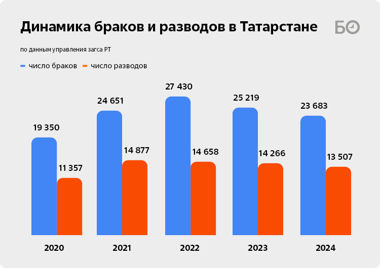 Если смотреть на последние несколько лет, то пик браков пришелся на 2022 год, когда сентябрьское объявление мобилизации резко увеличило число супружеских пар: в октябре количество зарегистрированных союзов увеличилось на 58%, в ноябре — на 89,8% год к году. Всплеск в количественном выражении быстро сменился плавным спадом. Если в 2022-м загс говорил о 27,4 тыс. новых браков, то в прошлом году их количество остановилось на отметке в 23,6 тысячи. Впрочем, республика по-прежнему остается лидером в Поволжье по числу свадеб.