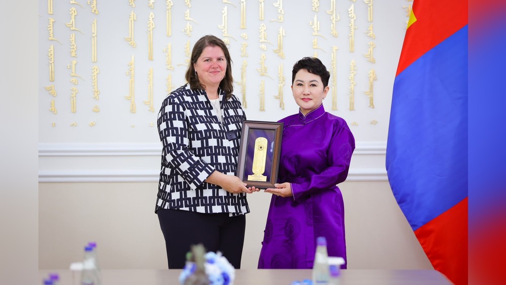 В завершение встречи Батцэцэг Батцэцэг вручила канадскому дипломату памятный подарок «Алтан Гэрэгэ» от Министерства иностранных дел Монголии.